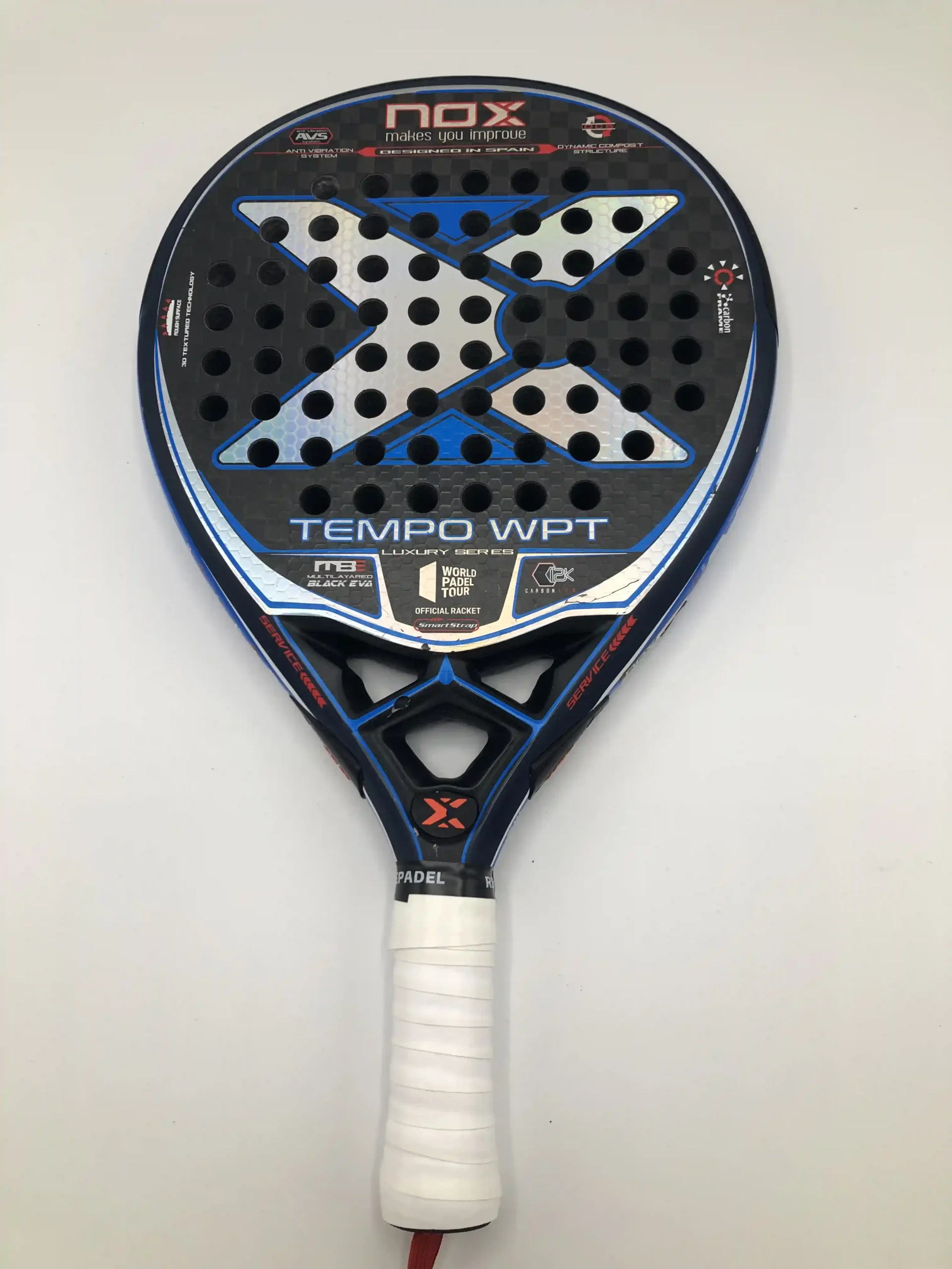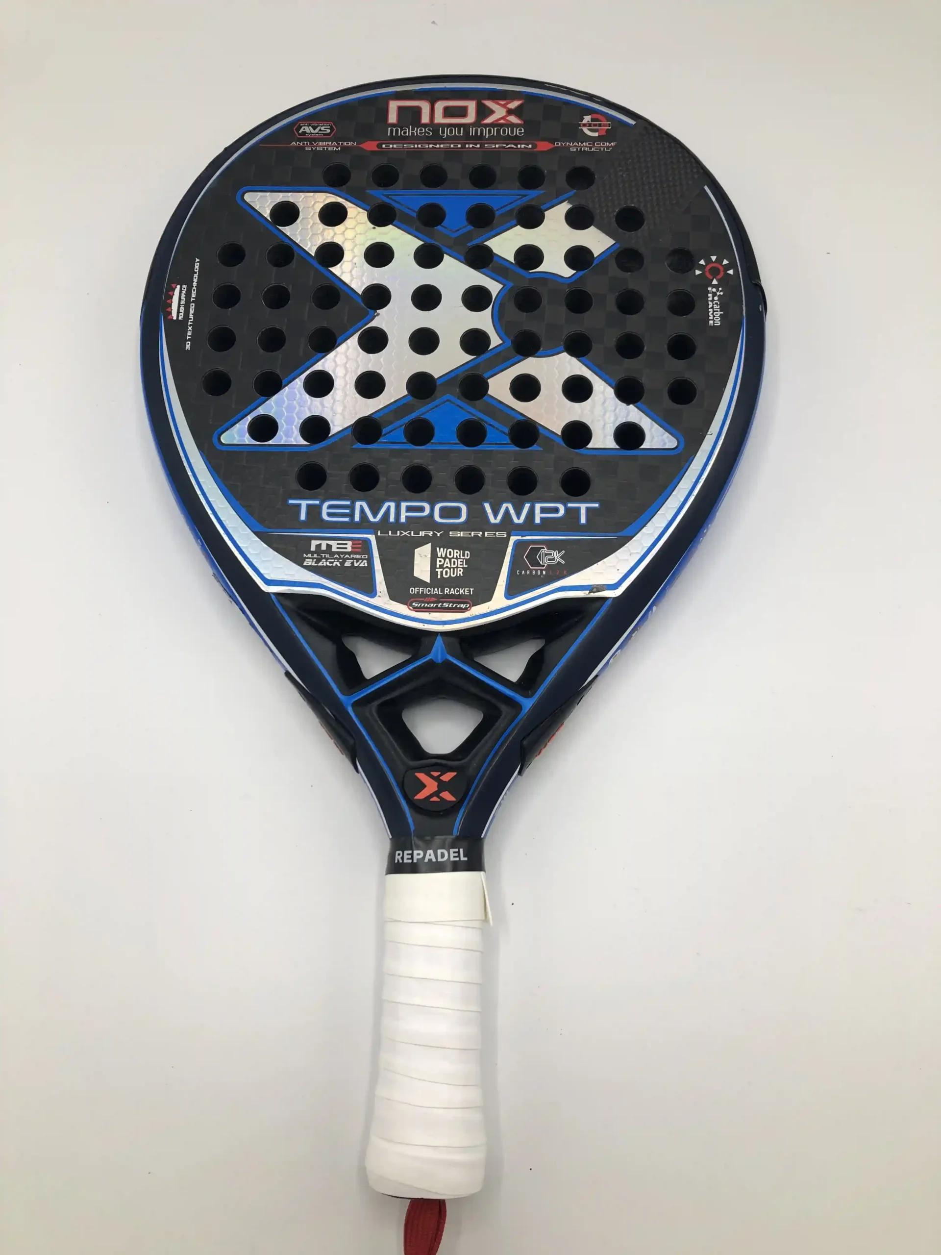 Nox Tempo WPT 12K – veelzijdig padelracket met druppelvorm voor een ideale balans tussen controle en power. Voorzien van een 12K carbon slagvlak voor extra stijfheid en explosieve slagen, een Multilayer Black EVA-kern voor comfortabele maar krachtige baloutput en een 100% carbon frame voor maximale stabiliteit en duurzaamheid. De ruwe afwerking geeft extra grip op de bal voor meer spin. Ideaal voor spelers die precisie en explosiviteit willen combineren.